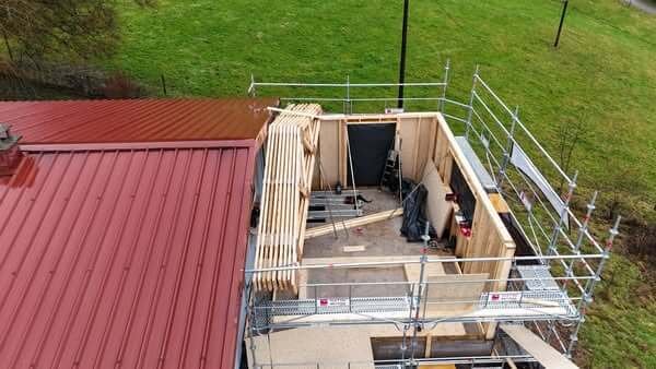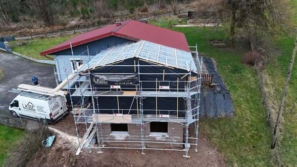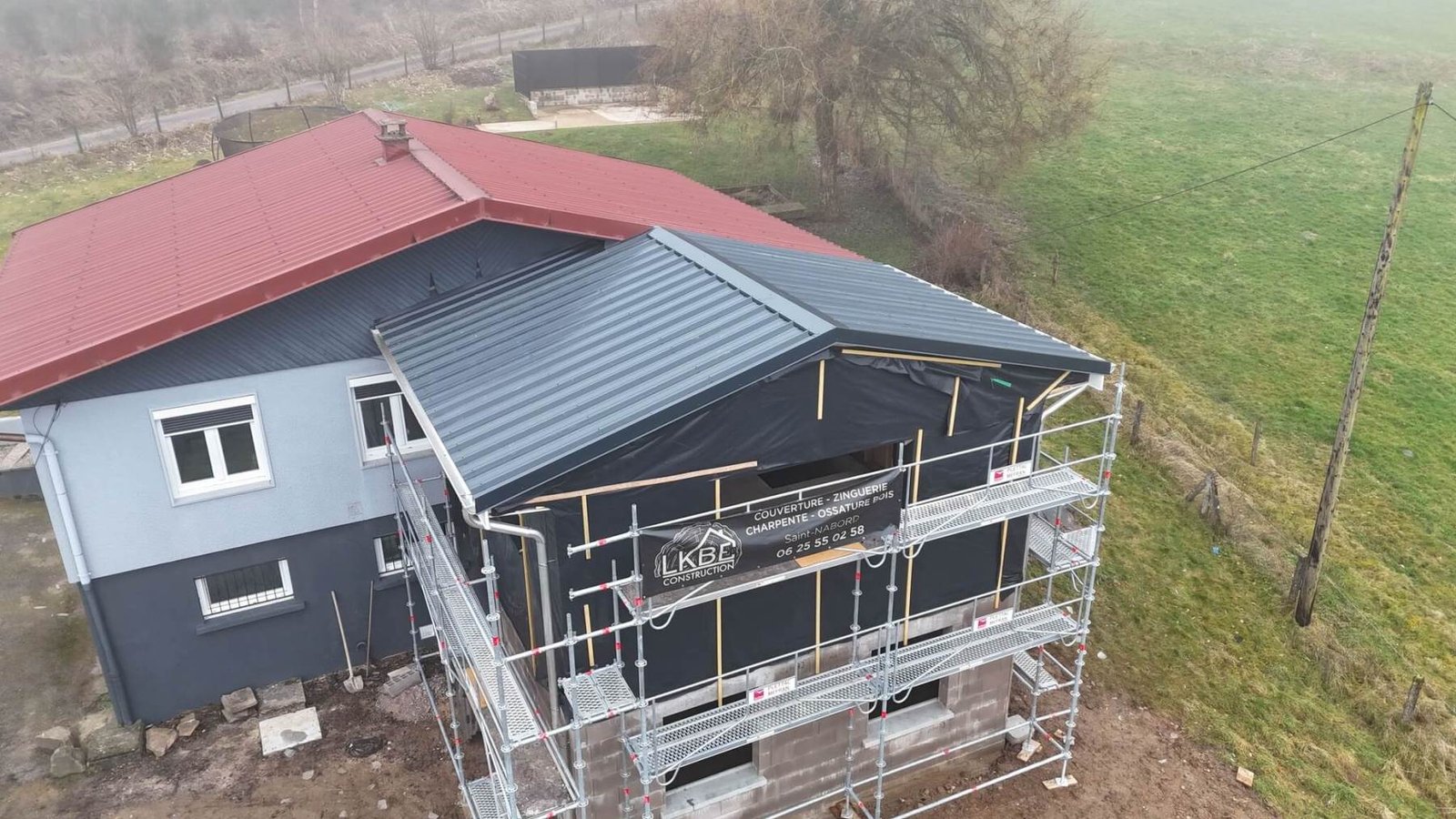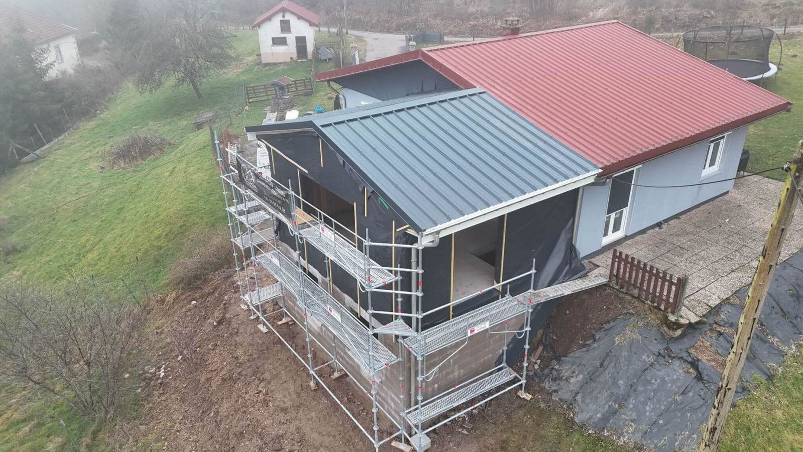 Agrandissement d’une maison existante avec une structure en maçonnerie pour le rez-de-chaussée et une ossature bois pour l’étage.